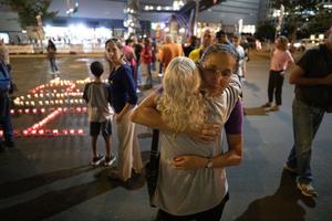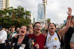 (251009) -- TEL AVIV, 9 octubre, 2025 (Xinhua) -- Israelíes se abrazan tras el anuncio de que Israel y Hamás...