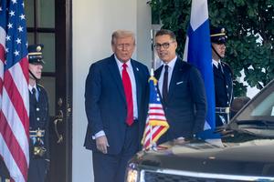 (251009) -- WASHINGTON, 9 octubre, 2025 (Xinhua) -- El presidente estadounidense, Donald Trump (2-i) da la bienvenida al presidente finlandés,...