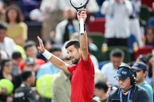 (251009) -- SHANGHAI, 9 octubre, 2025 (Xinhua) -- Novak Djokovic saluda a los espectadores al término de los cuartos de...
