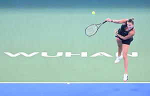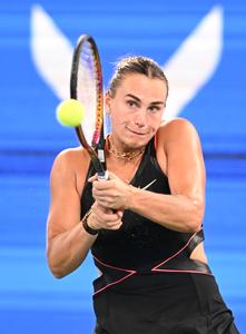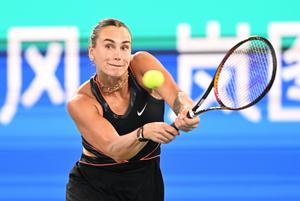 (251009) -- WUHAN, 9 octubre, 2025 (Xinhua) -- Aryna Sabalenka, de Bielorrusia, devuelve la pelota durante el partido de octavos...