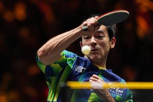 (251004) -- BEIJING, 4 octubre, 2025 (Xinhua) -- Hugo Calderano devuelve la pelota durante el partido de cuartos de final...