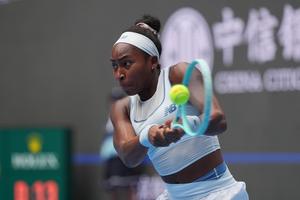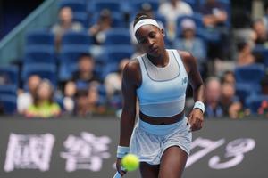 (251004) -- BEIJING, 4 octubre, 2025 (Xinhua) -- Coco Gauff devuelve la pelota durante el partido de semifinal de individuales...