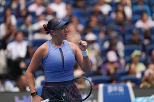 (251004) -- BEIJING, 4 octubre, 2025 (Xinhua) -- Amanda Anisimova festeja un punto durante el partido de semifinal de individuales...