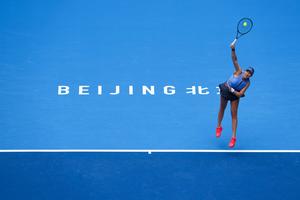(251004) -- BEIJING, 4 octubre, 2025 (Xinhua) -- Amanda Anisimova sirve la pelota durante el partido de semifinal de individuales...