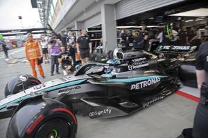 (251004) -- SINGAPUR, 4 octubre, 2025 (Xinhua) -- El piloto británico de la escudería Mercedes, George Russell, conduce durante la...