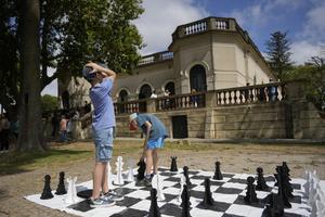 (251004) -- MONTEVIDEO, 4 octubre, 2025 (Xinhua) -- Niños juegan con un ajedrez gigante frente al Museo Histórico Nacional. Casa...