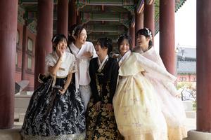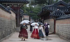 (251005) -- SEUL, 5 octubre, 2025 (Xinhua) -- Personas vestidas con el traje tradicional coreano "Hanbok" visitan el Palacio Gyeongbokgung,...
