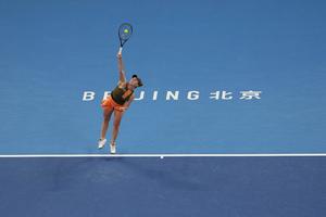 (251004) -- BEIJING, 4 octubre de 2025 (Xinhua) -- Linda Noskova sirve la pelota durante el partido de semifinales de...