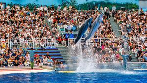(251004) -- BEIJING, 4 octubre, 2025 (Xinhua) -- Turistas disfrutan de una presentación en un parque oceánico, en Tianjin, en...