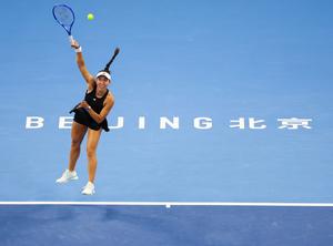 (251003) -- BEIJING, 3 octubre, 2025 (Xinhua) -- Jessica Pegula sirve la pelota durante el partido de cuartos de final...