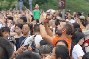 (251003) -- CHONGQING, 3 octubre, 2025 (Xinhua) -- Un turista de Kazajistán toma fotografías de la Estación Liziba del sistema...