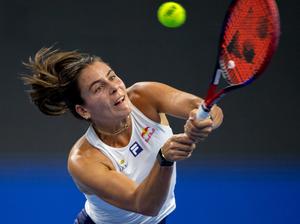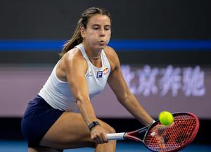(251003) -- BEIJING, 3 octubre, 2025 (Xinhua) -- Emma Navarro devuelve la pelota durante el partido de cuartos de final...