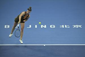 (251005) -- BEIJING, 5 octubre, 2025 (Xinhua) -- Linda Noskova sirve la pelota durante el partido final de individuales femeninos...