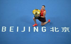 (251005) -- BEIJING, 5 octubre, 2025 (Xinhua) -- Amanda Anisimova reacciona durante la ceremonia de premiación al término del partido...