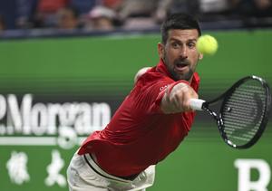 (251003) -- SHANGHAI, 3 octubre, 2025 (Xinhua) -- Novak Djokovic devuelve la pelota durante el partido de treintaidosavos de final...