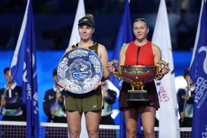 (251005) -- BEIJING, 5 octubre, 2025 (Xinhua) -- La ganadora del primer lugar, Amanda Anisimova (d) y la ganadora del...