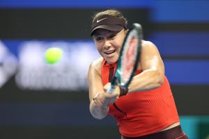 (251005) -- BEIJING, 5 octubre, 2025 (Xinhua) -- Amanda Anisimova devuelve la pelota durante el partido final de individuales femeninos...