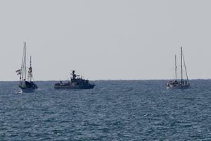 (251003) -- ASHDOD, 3 octubre, 2025 (Xinhua) -- Imagen del 2 de octubre de 2025 de embarcaciones de la Flotilla...