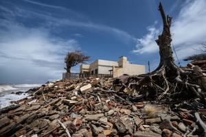 (251005) -- ATAFONA, 5 octubre, 2025 (Xinhua) -- Imagen del 4 de octubre de 2025 de ruinas costeras erosionadas por...