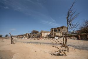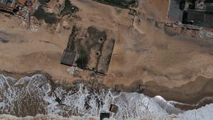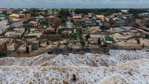 (251005) -- ATAFONA, 5 octubre, 2025 (Xinhua) -- Imagen del 4 de octubre de 2025 de restos de casas erosionadas...