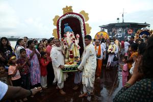(251002) -- YANGON, 2 octubre, 2025 (Xinhua) -- Devotos hindúes celebran el último día del Festival Durga Puja, en Yangón,...