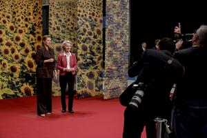 (251002) -- COPENHAGUE, 2 octubre, 2025 (Xinhua) -- La presidenta de la Comisión Europea, Ursula von der Leyen (2-i), posa...