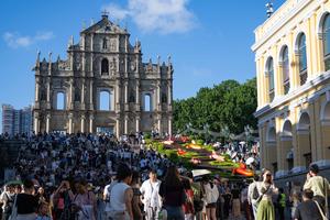 (251002) -- BEIJING, 2 octubre, 2025 (Xinhua) -- Turistas visitan las Ruinas de la Catedral de San Pablo, en Macao,...