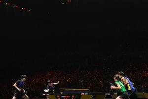 (251002) -- BEIJING, 2 octubre, 2025 (Xinhua) -- Wang Chuqin (i)/Sun Yingsha (2-i) compiten durante la semifinal de dobles mixtos...