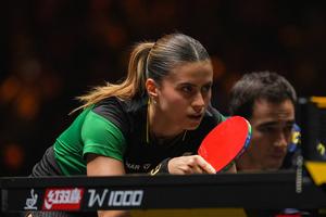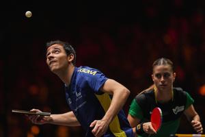 (251002) -- BEIJING, 2 octubre, 2025 (Xinhua) -- Hugo Calderano (i)/Bruna Takahashi compiten durante la semifinal de dobles mixtos entre...