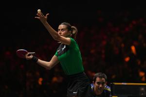 (251002) -- BEIJING, 2 octubre, 2025 (Xinhua) -- Wang Chuqin (i)/Sun Yingsha compiten durante la semifinal de dobles mixtos entre...