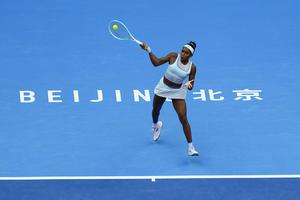 (251002) -- BEIJING, 2 octubre, 2025 (Xinhua) -- Coco Gauff devuelve la pelota durante el partido de cuartos de final...