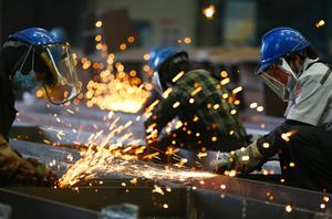 (251002) -- BEIJING, 2 octubre, 2025 (Xinhua) -- Trabajadores esmerilan componentes de acero en un taller, en la ciudad de...