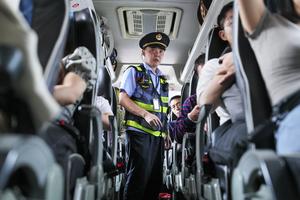(251002) -- BEIJING, 2 octubre, 2025 (Xinhua) -- Un oficial de la ley de transporte inspecciona un autobús, en el...