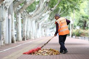 (251002) -- BEIJING, 2 octubre, 2025 (Xinhua) -- Un trabajador de saneamiento barre hojas caídas, en el distrito de Wenxian,...
