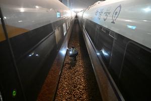 (251001) -- ZHENGZHOU, 1 octubre, 2025 (Xinhua) -- Imagen del 30 de septiembre de 2025 de mecánicos revisando un tren...