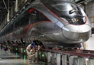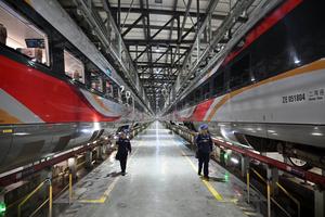(251001) -- ZHENGZHOU, 1 octubre, 2025 (Xinhua) -- Trabajadores limpian trenes bala, en Zhengzhou, en la provincia de Henan, en...