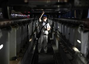 (251001) -- ZHENGZHOU, 1 octubre, 2025 (Xinhua) -- Imagen del 30 de septiembre de 2025 de un mecánico revisando un...