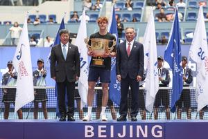 (251001) -- BEIJING, 1 octubre, 2025 (Xinhua) -- Jannik Sinner (c), posa para una fotografía durante la ceremonia de premiación...