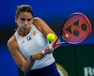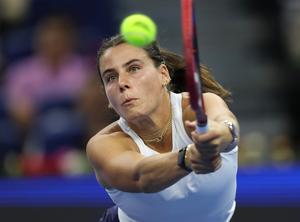 (251001) -- BEIJING, 1 octubre, 2025 (Xinhua) -- Emma Navarro compite durante el partido octavos de final de individuales femeninos...