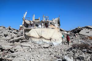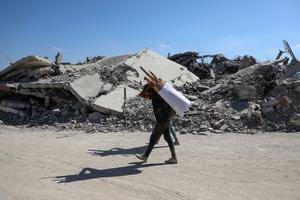 (251027) -- GAZA, 27 octubre, 2025 (Xinhua) -- Un palestino es visto en una calle con edificios destruidos, en el...