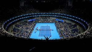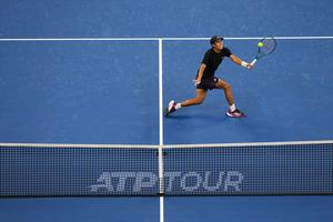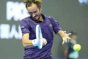 (250930) -- BEIJING, 30 septiembre, 2025 (Xinhua) -- Daniil Medvedev devuelve la pelota durante el partido de semifinales de individuales...