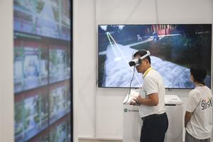 (250930) -- SHANGHAI, 30 septiembre, 2025 (Xinhua) -- Un visitante participa en una experiencia de realidad virtual durante una exposición...