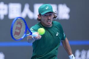 (250930) -- BEIJING, 30 septiembre, 2025 (Xinhua) -- Alex De Minaur devuelve la pelota durante el partido de semifinales de...
