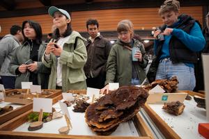 (251027) -- VANCOUVER, 27 octubre, 2025 (Xinhua) -- Imagen del 26 de octubre de 2025 de personas observando setas exhibidas...