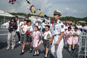 (250930) -- HONG KONG, 30 septiembre, 2025 (Xinhua) -- Niños visitan el buque naval Qi Jiguang del Ejército Popular de...