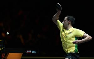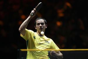 (240930) -- BEIJING, 30 septiembre, 2025 (Xinhua) -- Hugo Calderano, de Brasil, devuelve la pelota durante el partido de dieciseisavos...