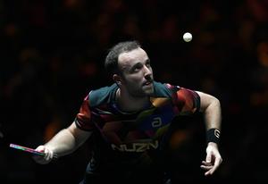 (240930) -- BEIJING, 30 septiembre, 2025 (Xinhua) -- Simon Gauzy, de Francia, sirve la pelota durante el partido de dieciseisavos...