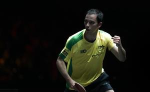 (240930) -- BEIJING, 30 septiembre, 2025 (Xinhua) -- Hugo Calderano, de Brasil, festeja después de ganar el partido de dieciseisavos...