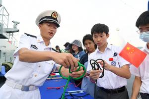(250930) -- HONG KONG, 30 septiembre, 2025 (Xinhua) -- Estudiantes aprenden a hacer nudos mientras visitan el buque naval Qi...
