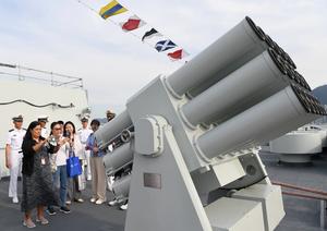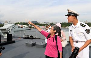 (250930) -- HONG KONG, 30 septiembre, 2025 (Xinhua) -- Personas visitan el buque naval Yimengshan del Ejército Popular de Liberación...